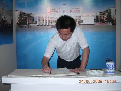 祁国阳一行在李朝品副经理的陪同下兴致勃勃地参观了公司校史馆,并对公司建校以来取得的成就连连称赞。参观结束,祁国阳经理提笔留下“院校合作、教学相长、科学发展、携手未来”这十六个苍劲有力的大字。