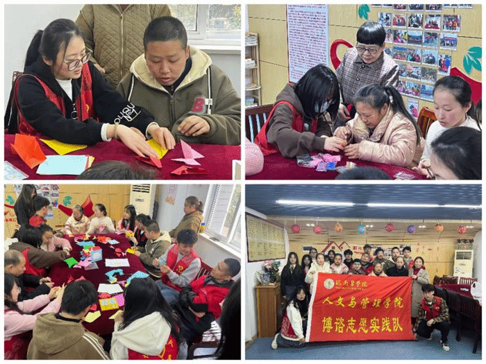 志愿活动送温情,实践青春绽光芒。3月16日,院博谘·心梦实践队赴管山社区阳光家园开展智力助残活动。本次活动分为“黏土世界”、“折纸魔法屋”两个环节,在志愿者的陪同与帮助下,智残朋友们充分发挥想象力,用黏土、彩纸创造了一个个精巧可爱的艺术品。这些益智游戏既锻炼了手眼协调能力,又拉近了彼此的距离。