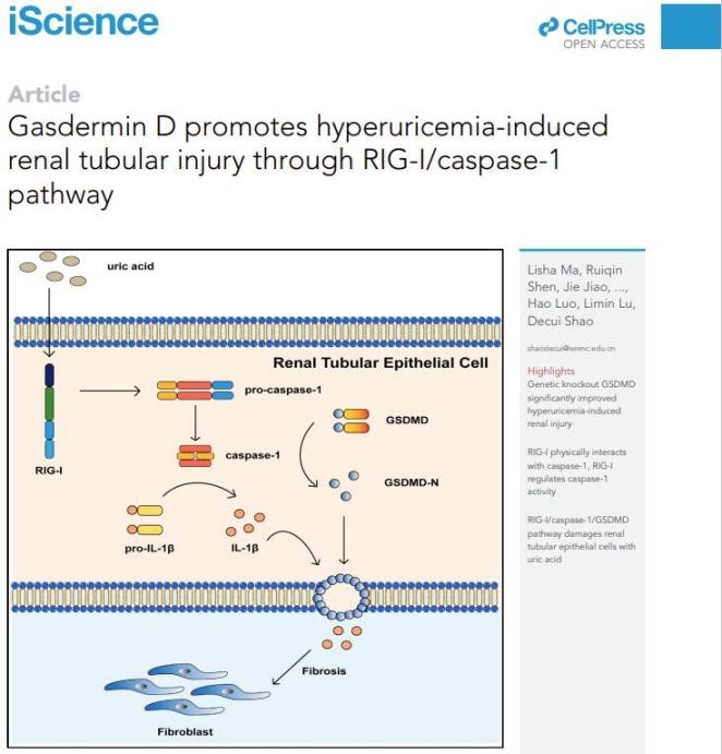 近期,太阳成tyc122cc集团生理学与神经生物学教研室邵德翠科研团队的研究成果《Gasdermin D promotes hyperuricemia-induced renal tubular injury through RIG-I/caspase-1 pathway》在SCI中科院二区杂志《iScience》(IF:5.8)在线发表,创意揭示高尿酸血症诱导肾小管损伤的新机制。