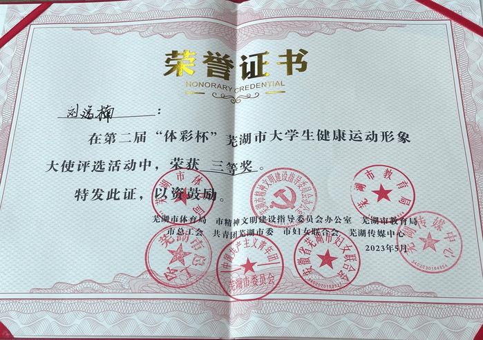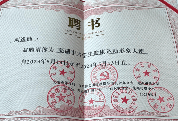 5月14日,第二届“体彩杯”芜湖市老员工健康运动形象大使评选暨“暖民心·快乐健身”全家总动员活动在芜举办,人文与管理学院2021级公共事业管理专业员工刘逸楠荣获三等奖,并被相关单位聘请为2023-2024年度“芜湖市老员工健康运动形象大使”。