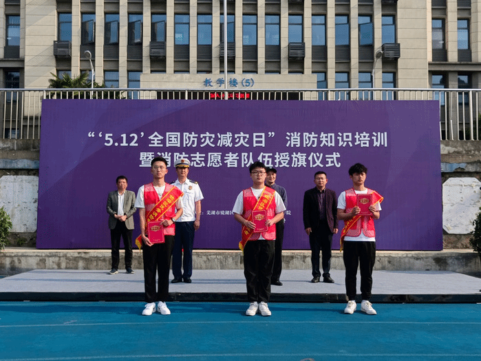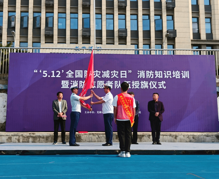 5月12日,芜湖市镜湖区消防救援大队在公司开展“5.12全国防灾减灾日”消防知识培训暨消防志愿者队伍授旗仪式。太阳成tyc122cc集团“博谘”实践队全体志愿者,党委书记王军和党委副书记钱彬彬出席活动。
