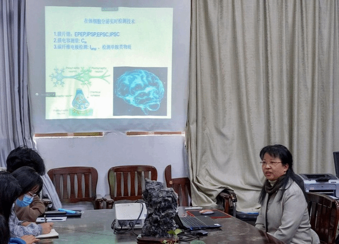 黄宏平以《在体细胞分泌检测技术在神经系统功能研究中的应用》为题,首先介绍我国脑科学研究前沿领域的攻关项目等背景。接着通过介绍自己的课题研究工作,分享了单胺类神经递质(如去甲肾上腺素,5-羟色胺等)的碳纤微电极检测技术所需要的实验装置、实验标本、实验方法,以及相关技术在应激所致抑郁症、高血压等疾病动物模型研究中的应用。