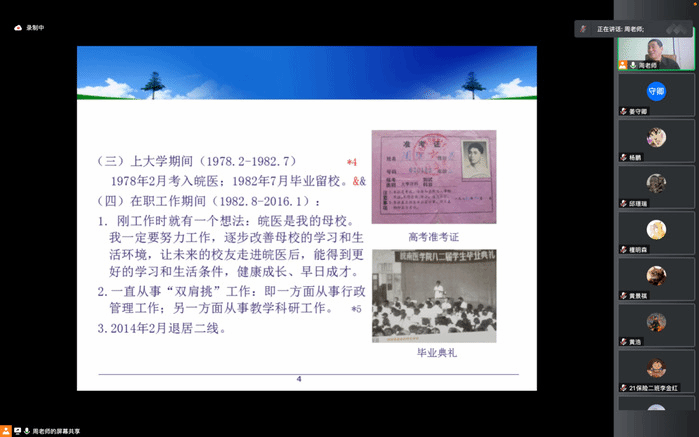 周强首先从自身的求学经历谈起,讲述了自己与皖医的不解之缘。刚工作时,他就立志献身皖医,逐步改善母校的学习、工作、生活环境,让未来的员工走进皖医后,能得到更好的发展条件,健康成长、早日成才。自2014年以来,他退居二线,始终坚持“退休不褪色、卸职不卸责”的原则,积极为师生服务。在宣传党的主张、传播党的思想方面尽心尽力,且成绩斐然,为广大青年学子树立了良好的人生导向。