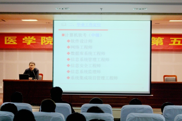 报告会分三个环节进行。第一环节由叶明全教授专门制作PPT,讲授医疗IT专业人才需求、毕业工作定位、毕业考研准备等相关问题,提出了就业方向与就业要求、考研方向与考研要求等方面建议。第二环节由胡鸿解答辅导员整理的员工提出的主要问题,通过举身边例子、列数据、以及对比的方式耐心解答。第三环节是员工现场提问,胡鸿和叶明全两位老师为员工们答疑解惑,提问期间气氛活跃。