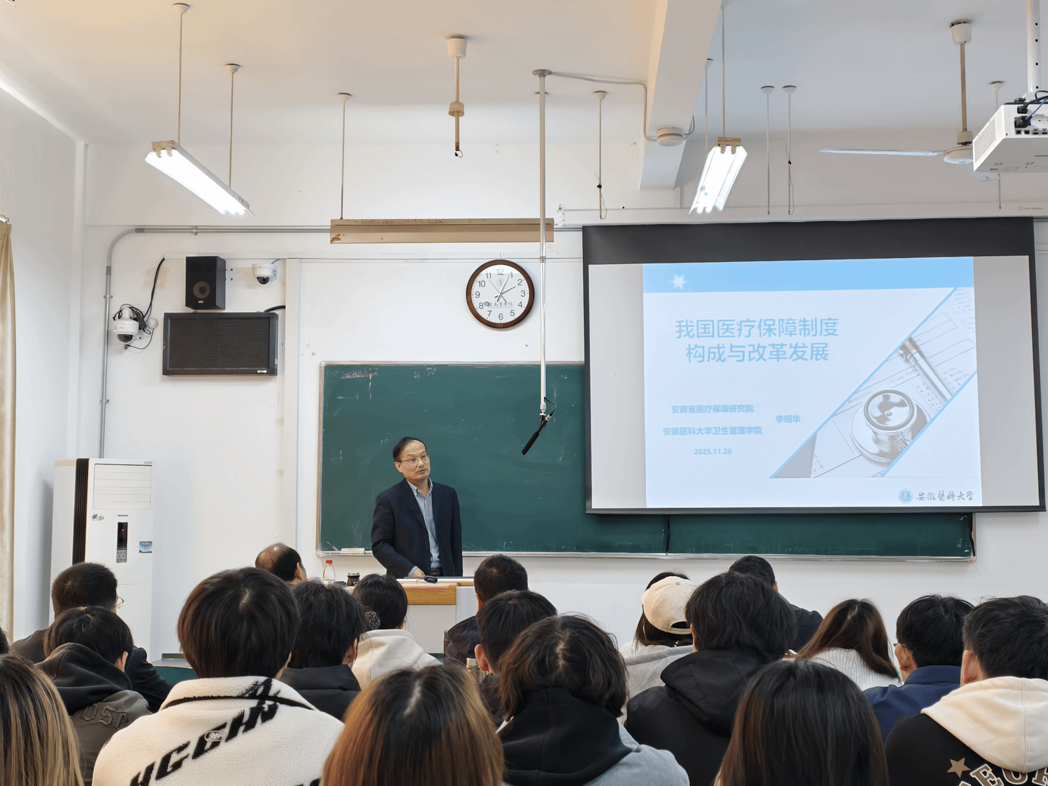 报告中,李绍华教授从社会保障制度的起源与构成切入,系统梳理了我国医疗保障制度的演进历程。他结合《中共中央 国务院关于深化医疗保障制度改革的意见》等纲领性文件,深入剖析了以“待遇保障、筹资运行、医保支付、基金监管”四大机制和“医药服务供给、医保管理服务”两大支撑为核心的改革顶层设计,并对长期护理保险、DRG/DIP支付方式改革、中医药按疗效价值付费等前沿热点进行了精准解读。整场报告高屋建瓴、内容翔实,兼具宏观政策视野与微观实践指引,引发了在场师生的深入思考。