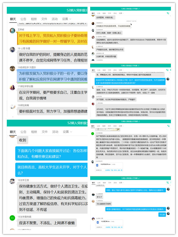 此次培训还组织了丰富的线上讨论学习,同学们表示,通过党课加深了对党的基本理论知识和疫情防控重点的了解,居家期间会认真配合公司、社区安排,认真学习、正常作息,适当去参加一些志愿服务活动,力所能及的去帮助他人,展现我们新时代青年的风采,不忘自己申请入党的初心,积极进取、勇于奋斗,朝着自己的目标不懈努力。