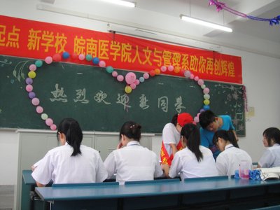 为了给远道而来的莘莘学子们带来一种舒适、亲切的感觉,使他们一进校园就能充分感受到一种“家”的氛围与浓浓温情,人文与管理系对新生报到处和绿色通道的接待室进行了特别的“装扮”和设计,大红的标语,用气球排成的“心”形图案,简单醒目的指示牌,别出心裁的人性化设计,都使得报到处的现场荡漾着一种温馨的情意。