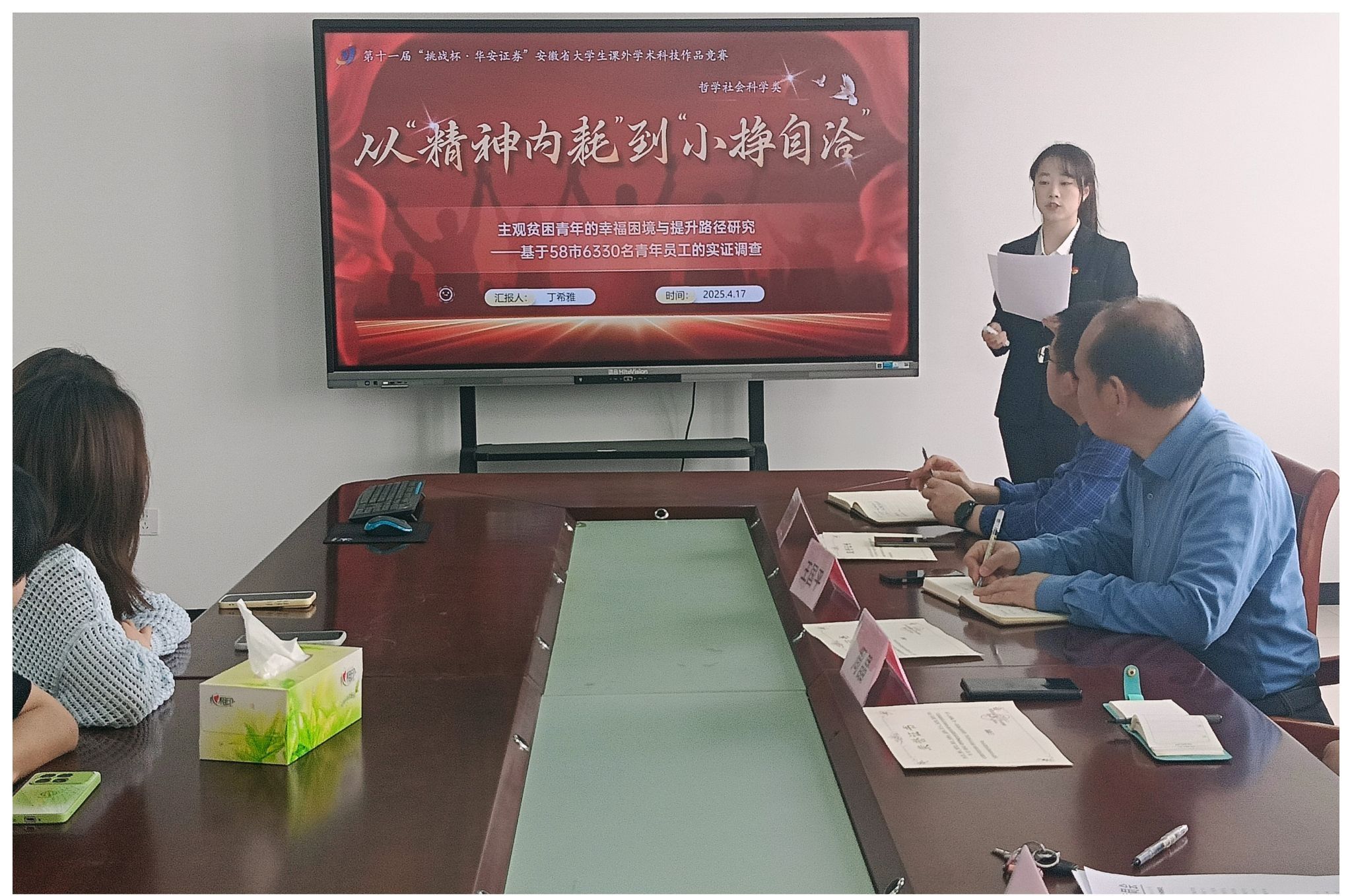 入围省赛的哲学社会科学类作品小组代表登台汇报研究成果。该作品聚焦当代青年心理困境,以“拒绝精神内耗”为主题,通过理论模型构建与实证数据分析,深入剖析社会压力下个体内耗的成因,并提出心理调适与社会支持的双向自洽路径。王国平和钱彬彬从选题现实意义、研究方法选择及社会推广价值等角度进行点评,肯定其理论深度与实践关怀,并建议进一步强化样本量化分析,优化PPT展示效果,为青年心理健康议题提供更具普适性的解决方案。