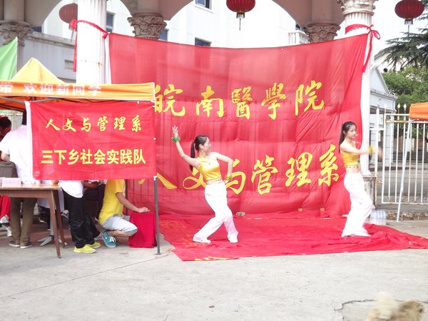 青春志愿活动之四褐山行:7月3日上午,人文与管理系志愿者们如火如荼地在四褐山社区开展文艺会演。独特的异国舞蹈、幽默的小品相声、生机勃勃的《最炫民族风》等节目,在炎炎夏日为四褐山居民带去了欢乐。同时,志愿者们向来往观看演出的居民发放法律常识宣传单宣传法律小常识、问卷调查居民基本情况并赠送防暑小礼品。引来居民们的一致好评。