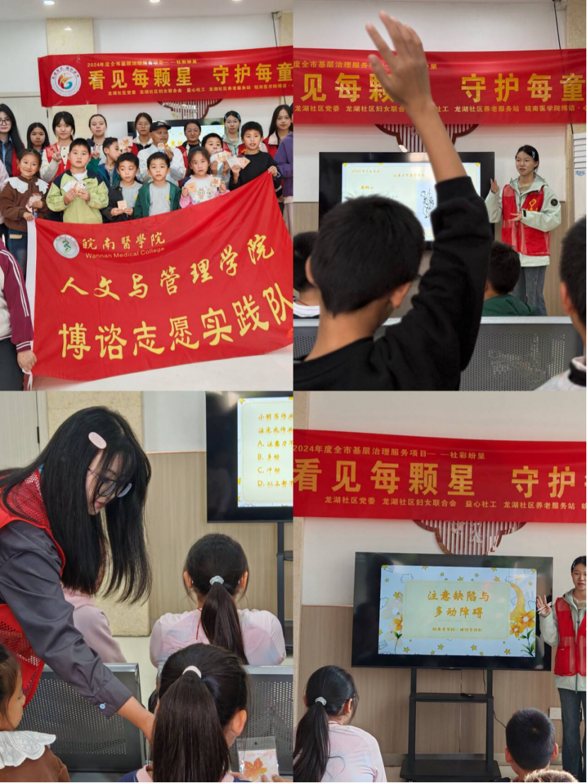 关注ADHD,点亮独特之星。下午,实践队在龙湖社区围绕ADHD(注意缺陷与多动障碍)开展了科普宣讲活动。志愿者以生动易懂的方式讲解了ADHD的相关知识,引导孩子们正确认识和理解行为差异。在随后的知识问答环节,孩子们积极踊跃参与,现场气氛热烈。志愿者们为孩子们准备了书签、日记本等小礼品,以激励他们的积极表现。孩子们脸上洋溢的笑容,为此次活动画上了温暖而圆满的句号。