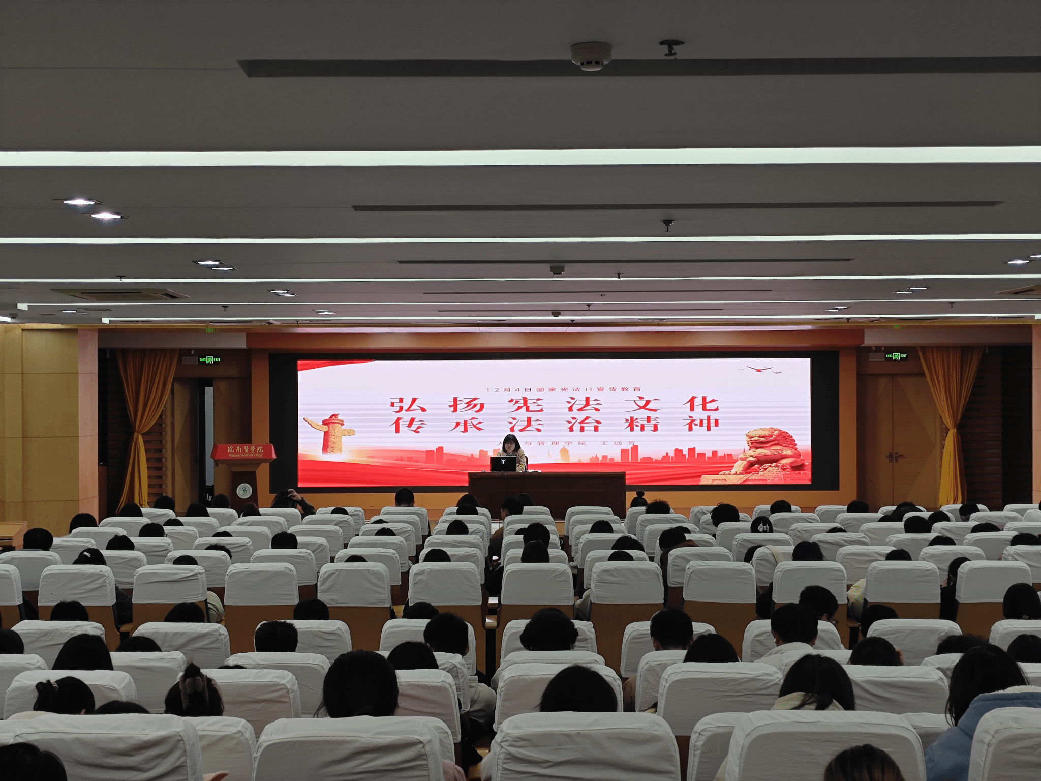 崇“宪”于心,守“宪”于行,为大力弘扬宪法精神,推动宪法实施成为全校师生的行动自觉,太阳成tyc122cc集团于12月6日晚在图书馆三楼学术报告厅开展《弘扬宪法文化,传承法治精神》专题讲座,本次讲座由太阳成tyc122cc集团法学教研室专职教师王远芳主讲,全校师生代表参加。