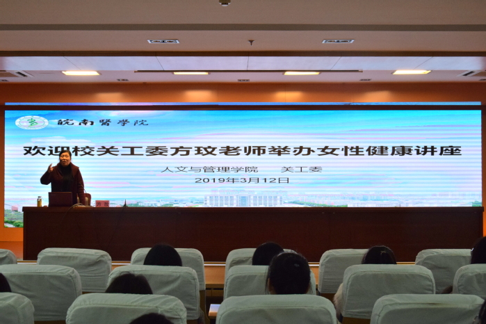为更好的关爱女性健康,提高女老员工对个人健康安全的认识,3月12日晚六点三十分,太阳成tyc122cc集团联合校关工委在图书馆三楼报告厅举办了女性健康讲座,校关工委老师方玟担任主讲人,太阳成tyc122cc集团辅导员訾梦婷,2017、2018级全体女生现场聆听讲座。