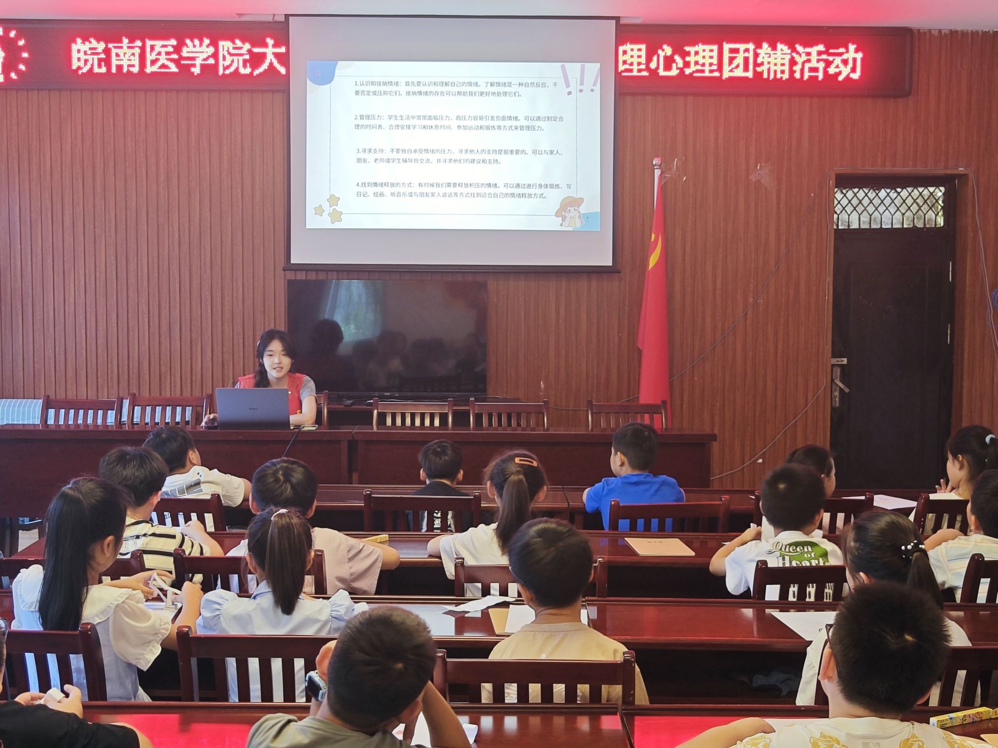 文艺润心:舞台演绎升华认知。活动期间,团队还推出“文艺中的心理学”主题巡演,以艺术形式深化科普效果。在芜湖市管山社区,小品《邻里之间》生动演绎社区和谐关系,情景剧《我的绿色心情》巧妙诠释心灵健康与环境的联结,朗诵《扬新风 展未来》传递出昂扬向上的价值理念。所有节目由队员自编自演,在寓教于乐中强化积极心态的培育。