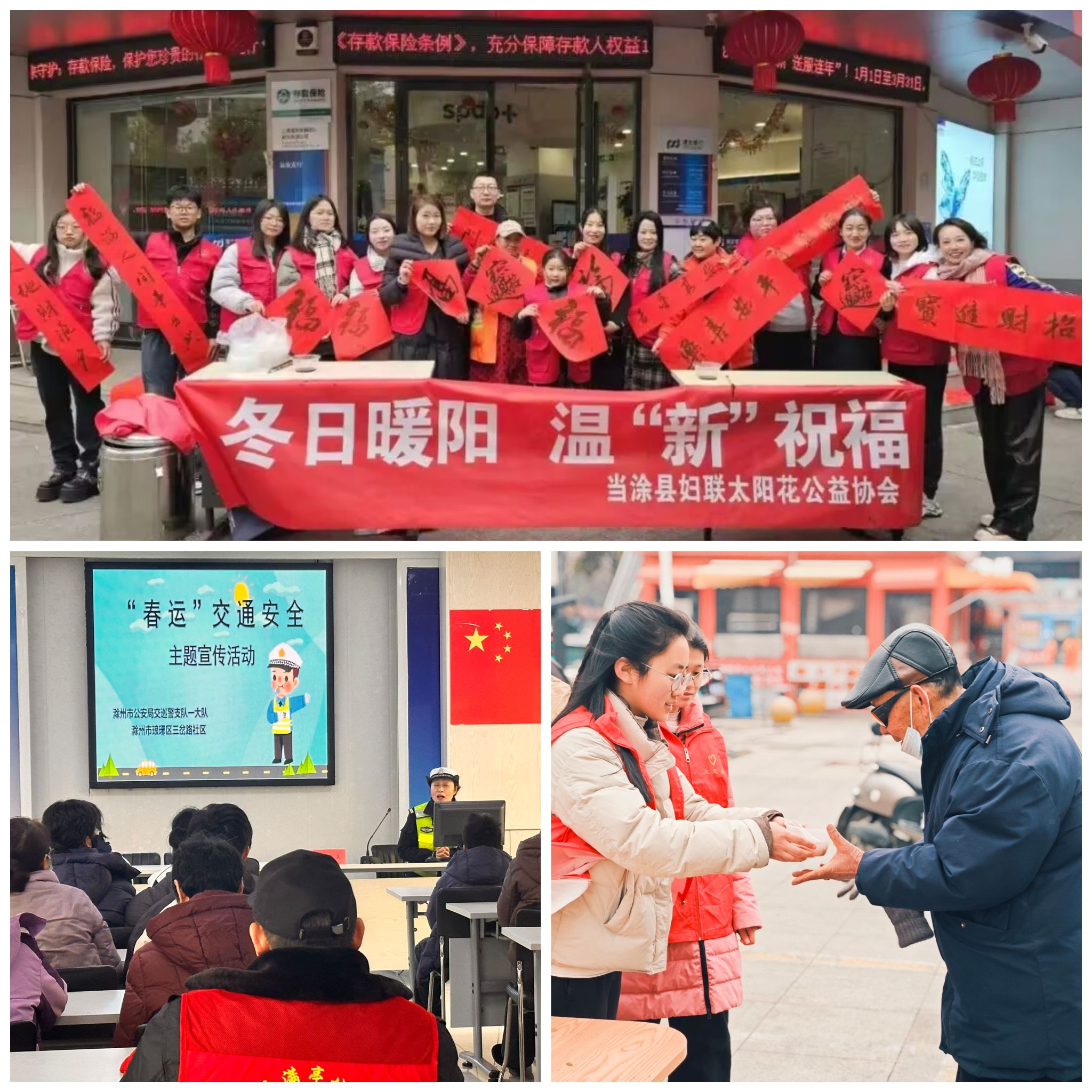 同学们深入各地开展“冬日暖阳”活动,佳节前夕赠送汤圆、春联、福字,营造浓厚节日氛围。同时,通过讲解、发资料等形式宣传交通安全知识,倡导文明出行,增强居民安全意识,为构建和谐社区添砖加瓦。